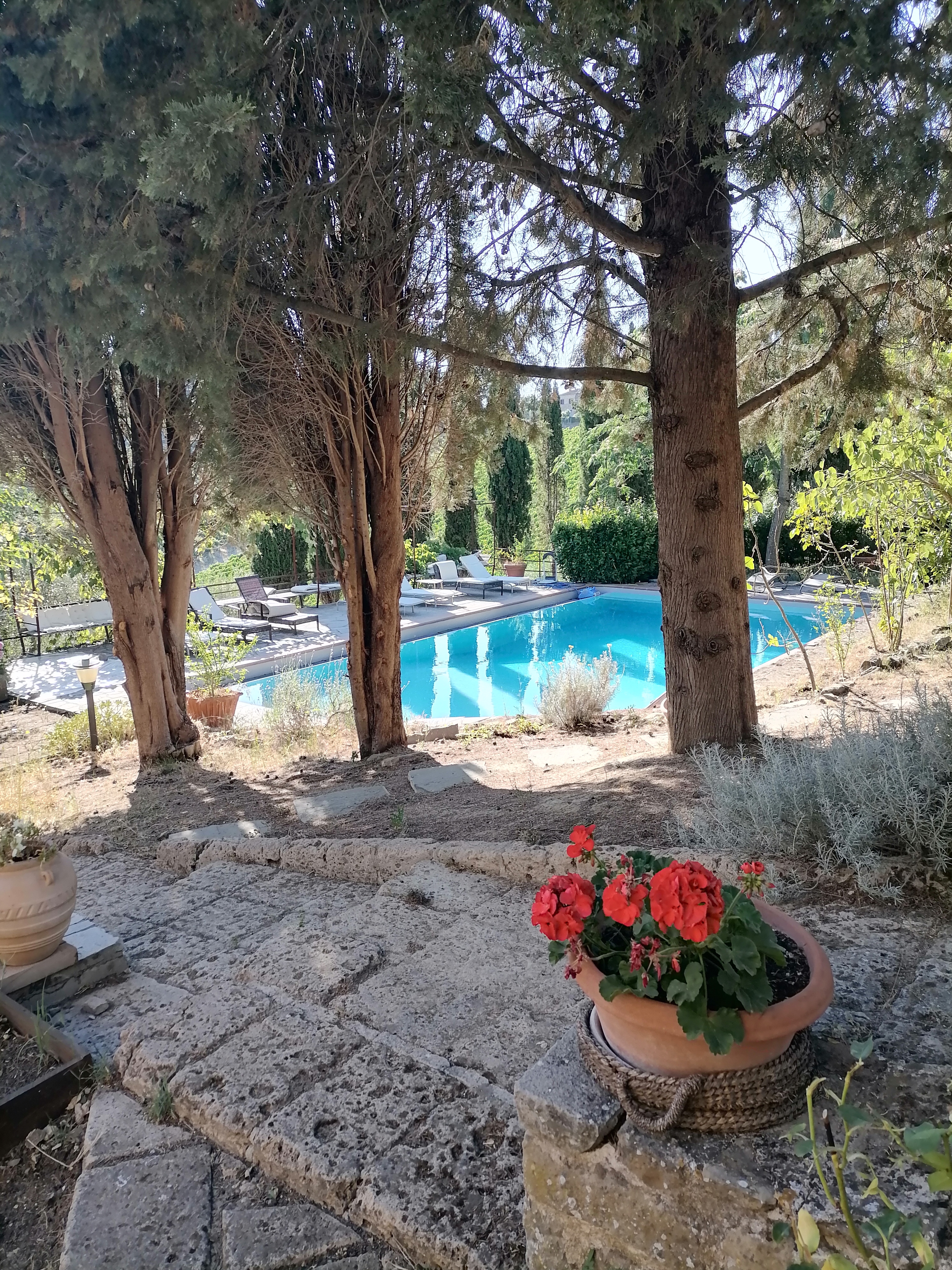 - Outdoor spaces: Private courtyard with historic wood-fired oven, shared panoramic pool (12×6 m) among olive trees and stunning panoramic terrace.